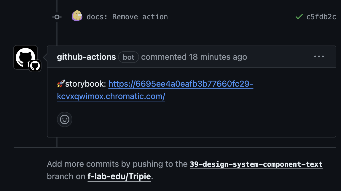 ์์ฑํ ๋๋ก๋ผ๋ฉด 21-design-system์ด๋ main์ผ๋ก pr์ ๋ ๋ฆฌ๋ฉด chromatic์ผ๋ก ์คํ ๋ฆฌ๋ถ์ ๋ฐฐํฌํด์ฃผ๊ณ , ํด๋น pr์ ์ฐ๋ฌ์ message์ธ "๐storybook: ${{ steps.chromatic.outputs.storybookUrl }}"๋ฅผ ๋ฌ์์ค ๊ฑฐ๋ผ ๊ธฐ๋ํ์ง๋ง,